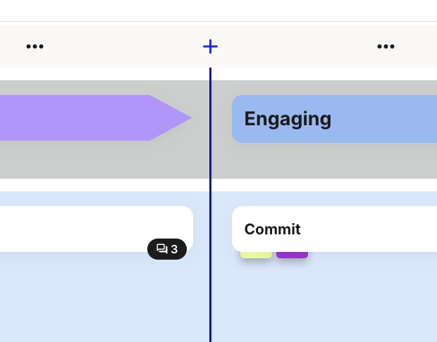 **Adding lanes or columns:** Hover between two column or lane headers, and a blue plus-button will appear, allowing you to add new elements.