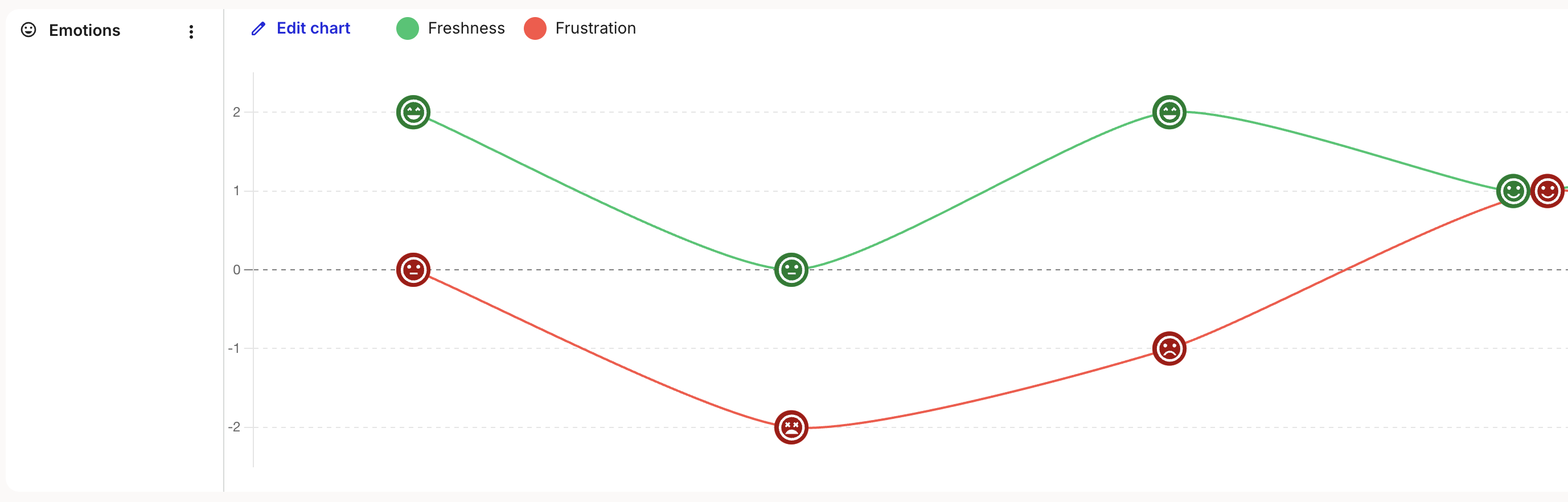 The Emotion chart is used to display the emotional journeys of either personas or non-personas. Emotions are represented as dots on a 5-point Likert scale ranging from -2 to +2 by default, these values are customizable. You can add as many emotional journeys to your chart as you like, allowing for detailed comparison.