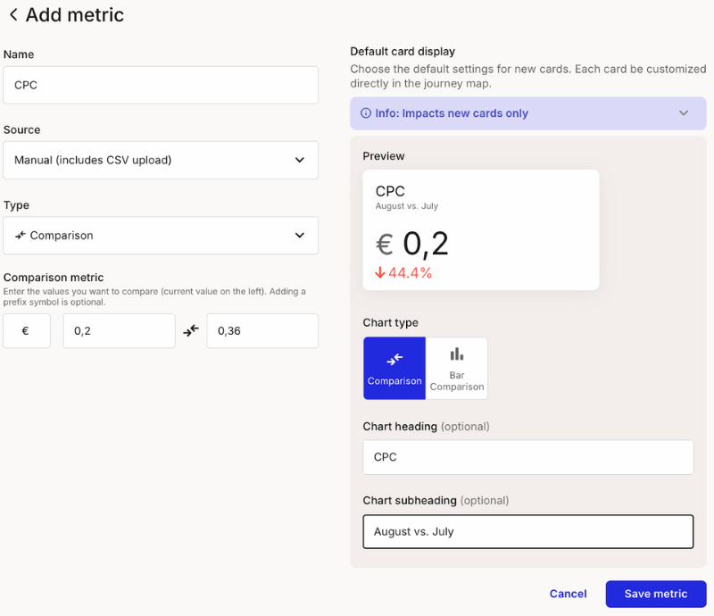 From a journey map: Add a new metric directly within your journey map with the metric card.